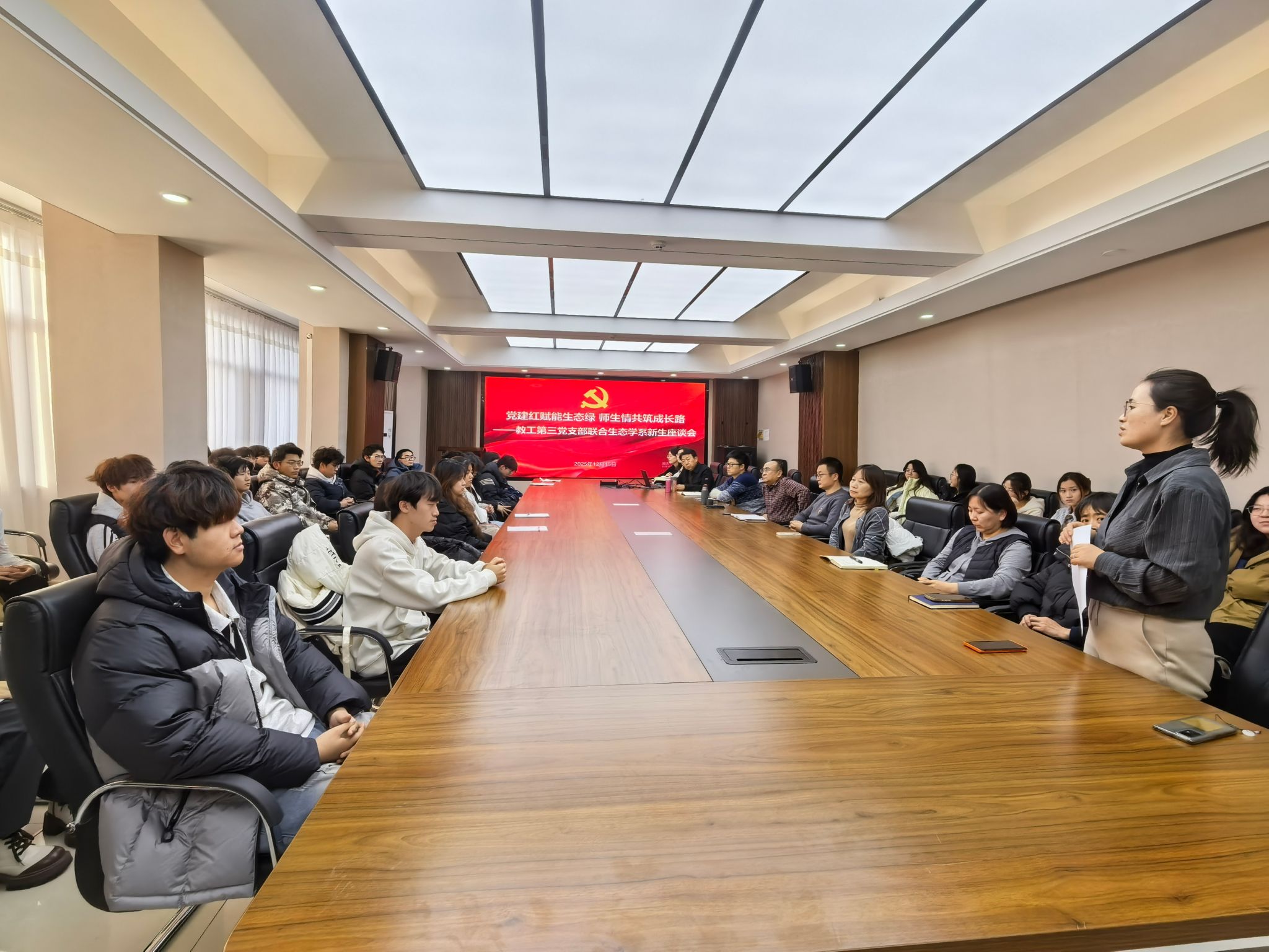 为了帮助新生切实解决专业学习与实践发展中的问题困惑,更好地搭建师生沟通交流渠道,12月15日下午,教工第三党支部联合生态学系召开师生座谈会。党员教师、任课教师代表及2025级生态班全体学生参加座谈会。座谈会由2025级生态班班主任郭金停主持。